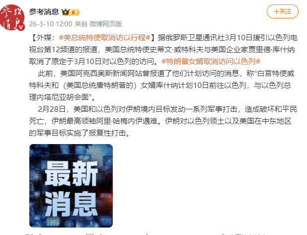 [外媒:美總統特使取消訪以行程]據俄羅斯衛星通訊社3月10日援引以色列電視臺第12頻道的外媒報道,美國總統特使史蒂文·威特科夫與美國企業家賈里德·庫什納取消了原定于3月10日對以色列的美總訪問。